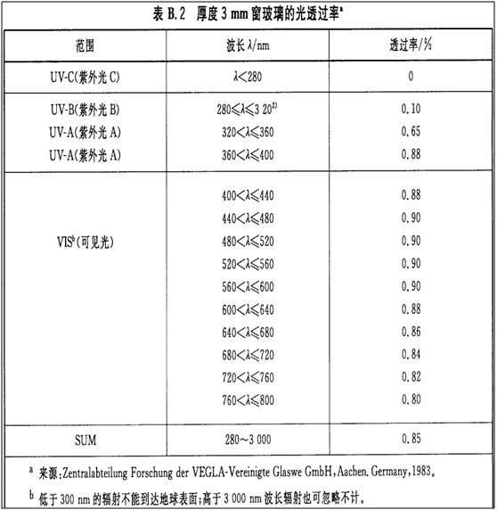 表B.2 百度3mm窗玻璃的光透過率