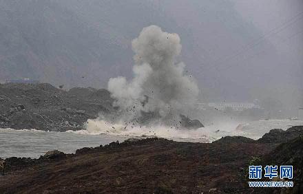 8月17日,第二次對巨石的爆破成功進行。當日,四川汶川縣映秀鎮(zhèn)對岷江紅椿溝段壅塞體進行了兩次爆破,使泄洪渠得到有效拓寬。據(jù)爆破現(xiàn)場負責人介紹,爆破主要是為消除8塊巨石,這些巨石超出了挖掘機的負荷量,必須選擇爆破方式解決。